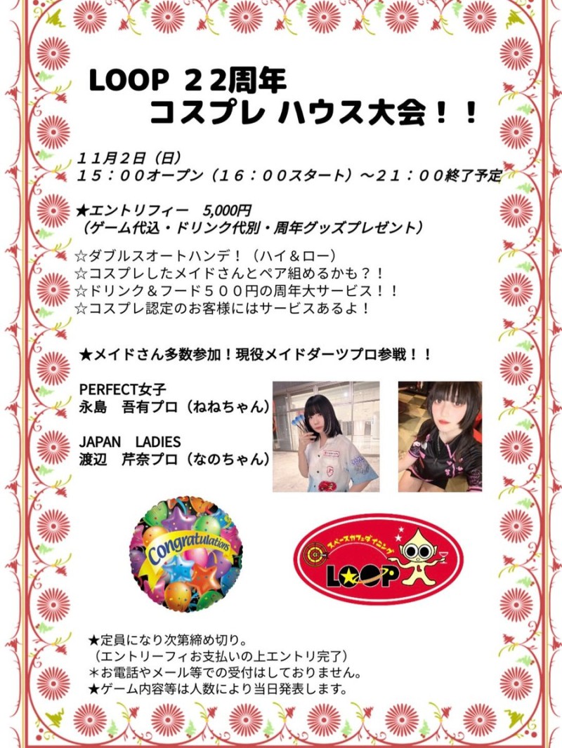 11月2日(日)祝前日の㊗️22周年コスプレハウストーナメント埋まってまいりました。