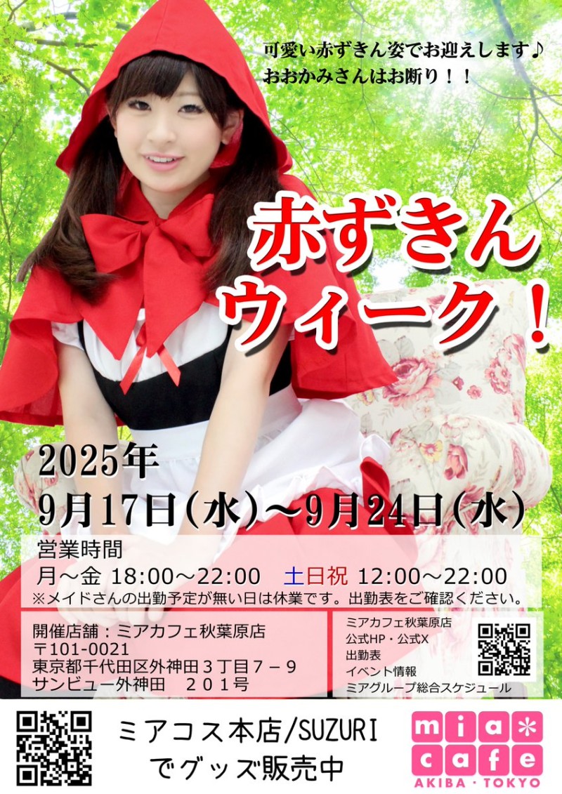 赤ずきんウィークinミアカフェ秋葉原店 2025年9月17日(水)~24日(水) 9月19日(金)  18-22 まな・初回勤務の新人さん 9月20日(土)  12-17 もも・りぼん  17-22 さぶま・くら 9月21日(日)  12-17 さぶま・もも  17-22 くら・まな 出勤一覧  https://t.co/inbQ85tzfB https://t.co/tDcSyyR3ho