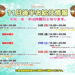 本日はご帰宅ありがとうございました💖 明日11/30(日)は13時から20時まで(ゲーム会13-16)🕰️ひめぷろ👑実桜BDイベント🌸実桜13-18♡🐣ももな13-20♡めい13-20 全てのお時間スムーズにご案内可能です💫 12/1(月)ゲストるみBD会&歌姫LIVE配信🎤 12/2(火)貸切のみ営業🌱 ご予約はDM[@mayroom_room]へ💌 https://t.co/DtiYaHmoMJ